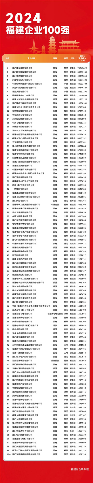 11月8日,2024福建企业100强发布大会召开会上发布了2024福建企业100强、2024福建制造业企业100强、2024福建服务业企业100强、2024福建战略新兴产业企业100强。四份名单一起来看——